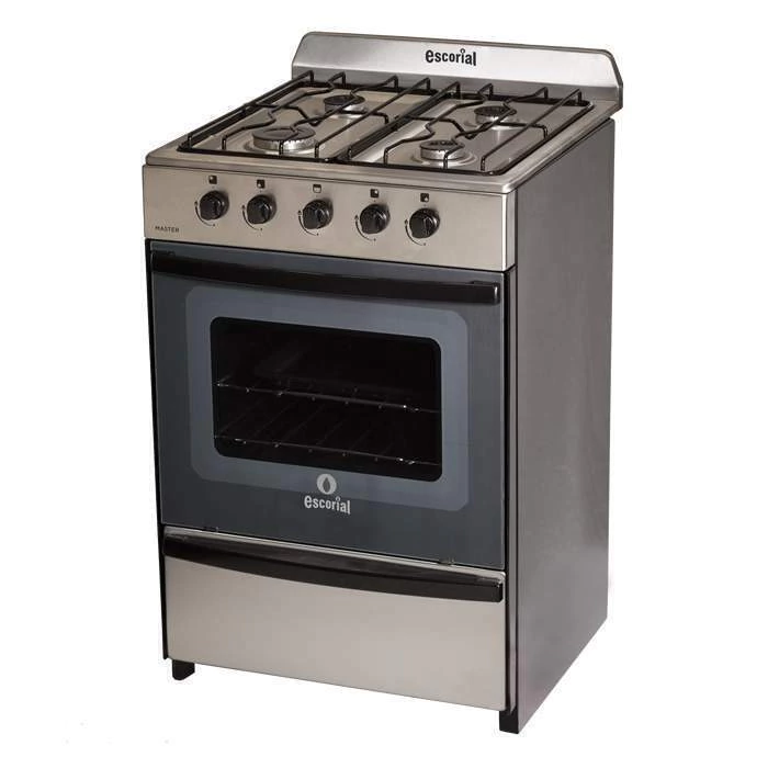 Acero inoxidable con tapa de horno de vidrio en grises y laterales negros.