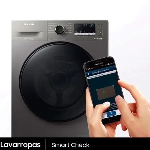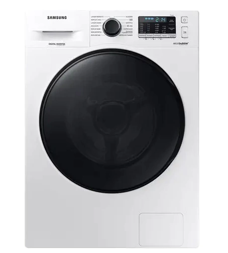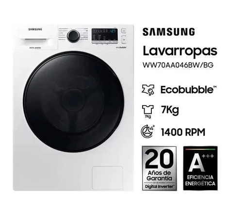 Diseño. El lavarropas automático WW70AA46BW de Samsung cuenta con una capacidad de lavado de 7 kg con carga frontal lo que te brinda resultados excelentes aún en agua fría. La rediseñada puerta Crystal Gloss proporciona lo último en placer estético y sofisticación para tu hogar, mientas que el exclusivo diseño Tambor Diamante es sumamente amable para tu ropa, al permitir un deslizamiento delicado, sin comprometer la integridad de las telas. Remoción de manchas. La función Bubble Soak ayuda a eliminar una gran variedad de manchas difíciles, como sangre, té, vino, maquillaje y pasto. La ropa se empapa a fondo en burbujas activas, por lo que la suciedad y las manchas se aflojan y pueden eliminarse con mayor efectividad. Es inverter. El motor Digital Inverter de Samsung, permiten un ahorro del 65% en el consumo de energía, sin comprometer la calidad del lavado. Además, cuenta con centrifugado de 1.400 RPM