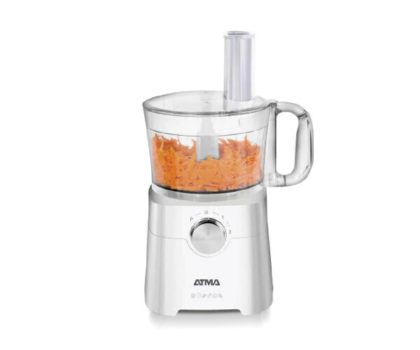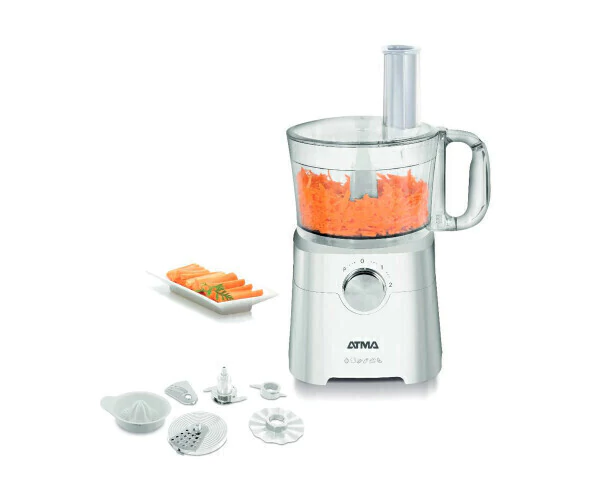 La multiprocesadora ATMA MP8405P posee una capacidad de 1,2 litros. Cuenta con una potencia de 650 watts, dos velocidades y pulsador.